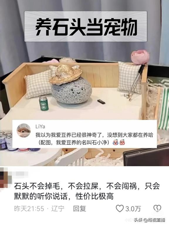 养宠物石头的相关帖子下还有一条高赞评论:“石头不掉毛、不拉屎、不闯祸,只会默默地听你说话,性价比极高”。