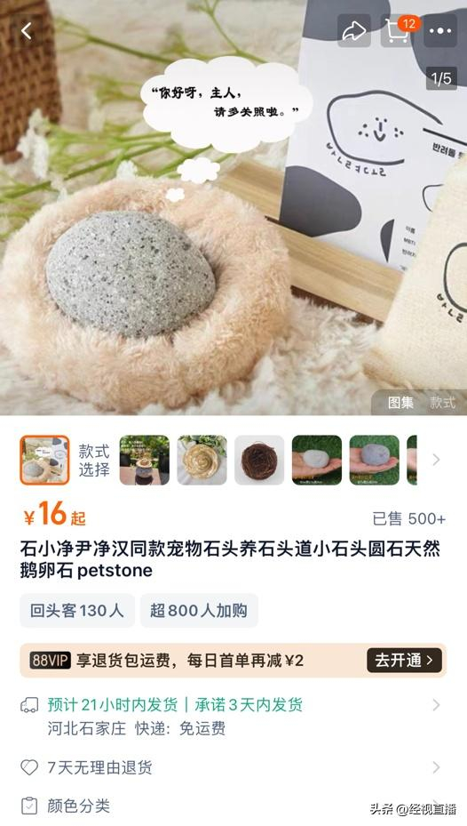 经视直播记者在淘宝购物平台搜索发现,大多宠物石头的售价在10到30元之间,某店铺工作人员告诉记者,这就是普通的鹅卵石,比外面捡的石头要好看些,“我们卖的都是圆圆胖胖的石头,仓库工作人员精心挑选的”。还有店铺工作人员表示,可以选择想要的形状和表面光滑程度,购买石头会附赠小推车和眼睛贴纸。