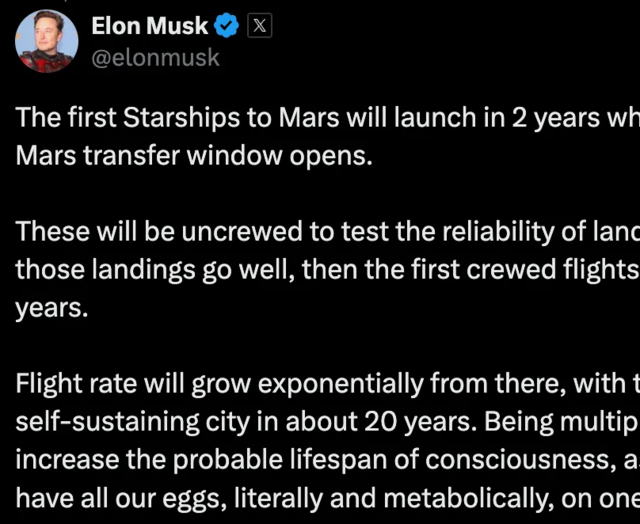 • 2年后: 首批 Starship 无人飞船将登陆火星,测试安全着陆的可行性