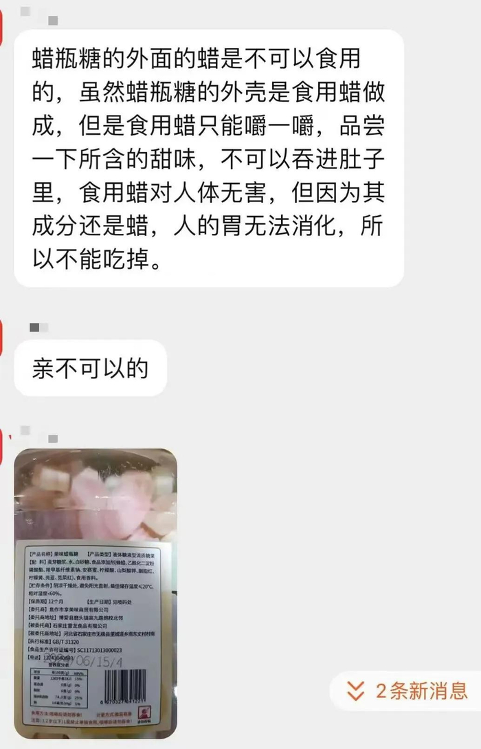 除了家长的质疑,蜡瓶糖的安全性也引起了关注。某蜡瓶糖店铺客服人员表示:“蜡瓶糖外面的蜡是不可以吞咽食用的。” “人的胃无法消化,所以不能吃掉。”