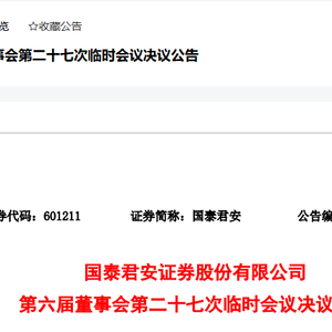 国泰君安证券股份有限公司(以下简称“本公司”或“公司”)于2024年8月30日以电子邮件方式发出第六届董事会第二十七次临时会议通知及文件,于2024年9月6日以书面审议、通讯表决方式召开第六届董事会第二十七次临时会议。