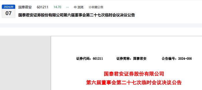 2024-09-07国泰君安:国泰君安证券股份有限公司第六届董事会第二十七次临时会议决议公告