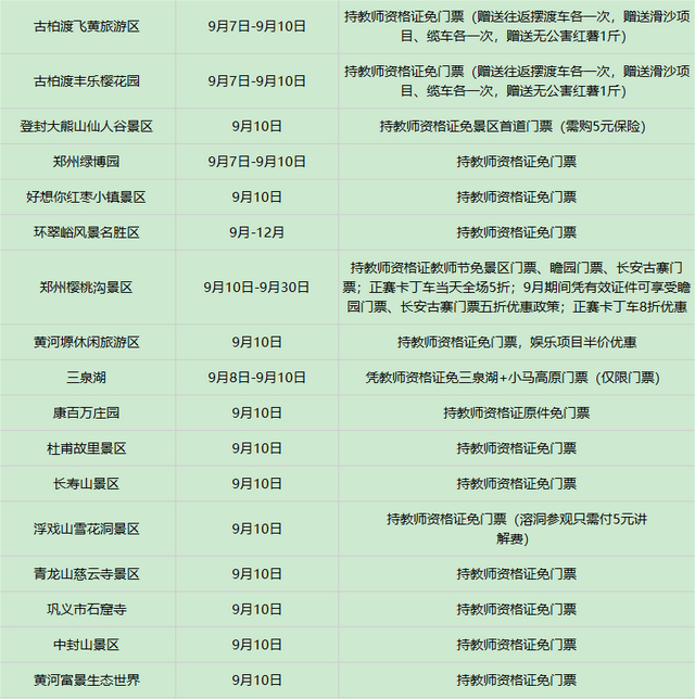 9月10日8:00至9月11日17:00止,持有效教师资格证件的全国大、中、小学及幼儿园等教师可免费游览以下景区: