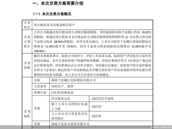 公告显示,千金药业拟通过发行股份的方式购买株洲国投、列邦康泰持有的千金湘江药业28.92%的股权,拟通过发行股份及支付现金的方式购买株洲国投和黄阳等21名自然人持有的千金协力药业68%的股权。本次发行股份的价格为8.77元/股,公司停牌前收盘价为9.97元/股。