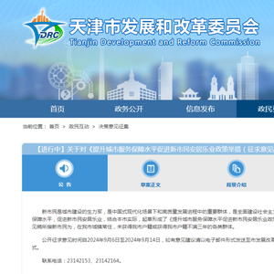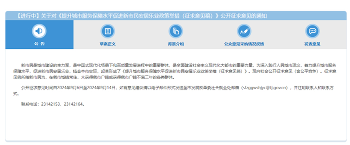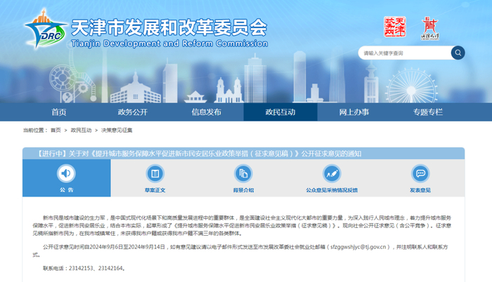 近日,天津市发改委发布《提升城市服务保障水平促进新市民安居乐业政策举措(征求意见稿)》,公开征求意见时间自2024年9月6日至2024年9月14日,如有意见建议请以电子邮件形式发送至市发展改革委社会就业处邮箱(sfzggwshjyc@tj.gov.cn),并注明联系人和联系方式。联系电话:23142153、23142164。