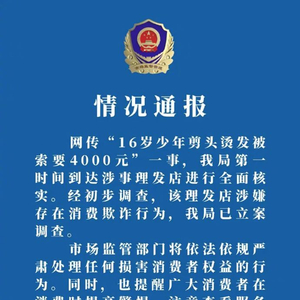 16岁少年剪头烫发被索要4000元!官方通报:理发店涉嫌消费欺诈,已立案