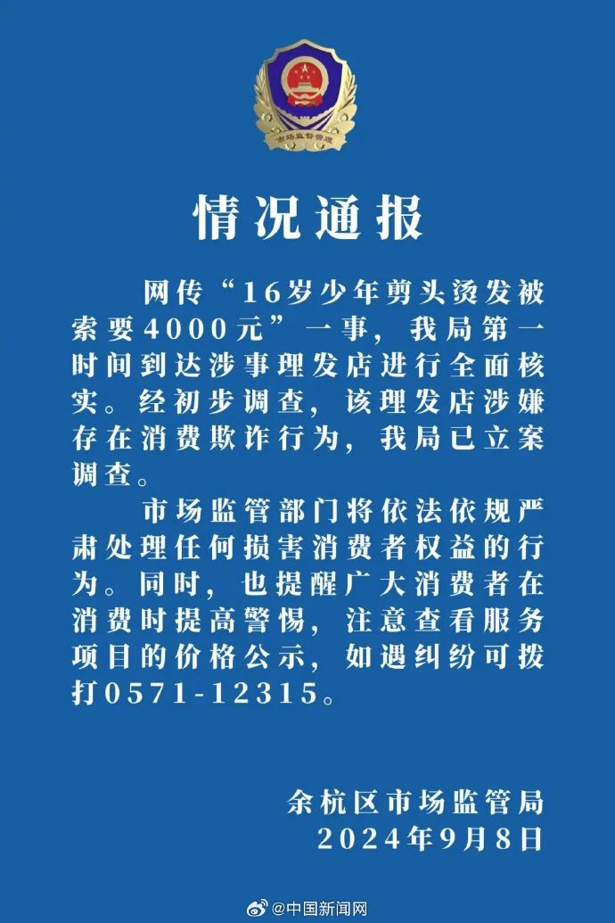 刚刚,浙江杭州余杭区市场监管局通报“16岁少年剪头烫发被索要4000元”:理发店涉嫌消费欺诈,已立案。