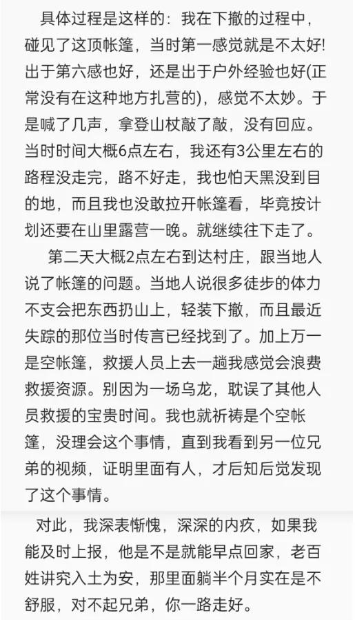 8月21日,该网友在社交账号发文解释了自己发现帐篷但未报警的原因。