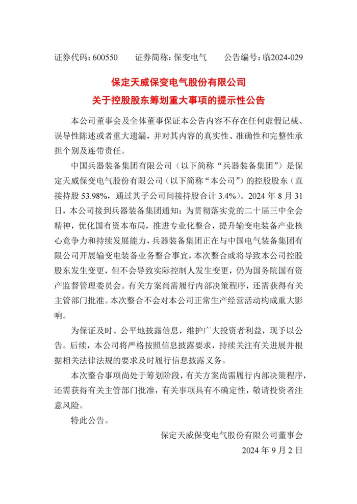 公告指出,2024年8月31日,保变电气接到兵器装备集团通知:为贯彻落实党的二十届三中全会精神,优化国有资本布局,推进专业化整合,提升输变电装备产业核心竞争力和持续发展能力,兵器装备集团正在与中国电气装备集团有限公司开展输变电装备业务整合事宜,本次整合或将导致本公司控股股东发生变更,但不会导致实际控制人发生变更,仍为国务院国有资产监督管理委员会。有关方案尚需履行内部决策程序,还需获得有关主管部门批准。