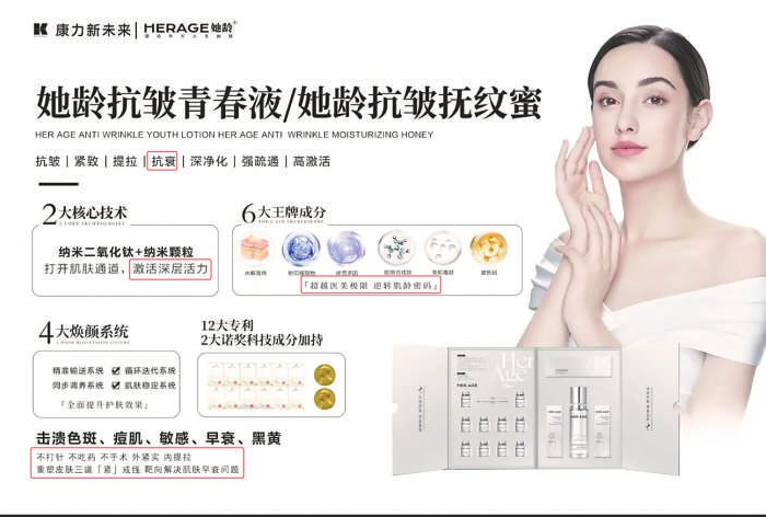 “她龄”宣称,“她龄抗皱青春液/她龄抗皱抚纹蜜”具有抗皱、紧致、提拉、抗衰、深净化、强疏通和高激活的特点,具有两大核心技术、四大焕颜系统以及多项专利加持,在不打针、不吃药、不手术的情况下即可重塑皮肤三道“紧”戒线,靶向解决肌肤早衰问题。