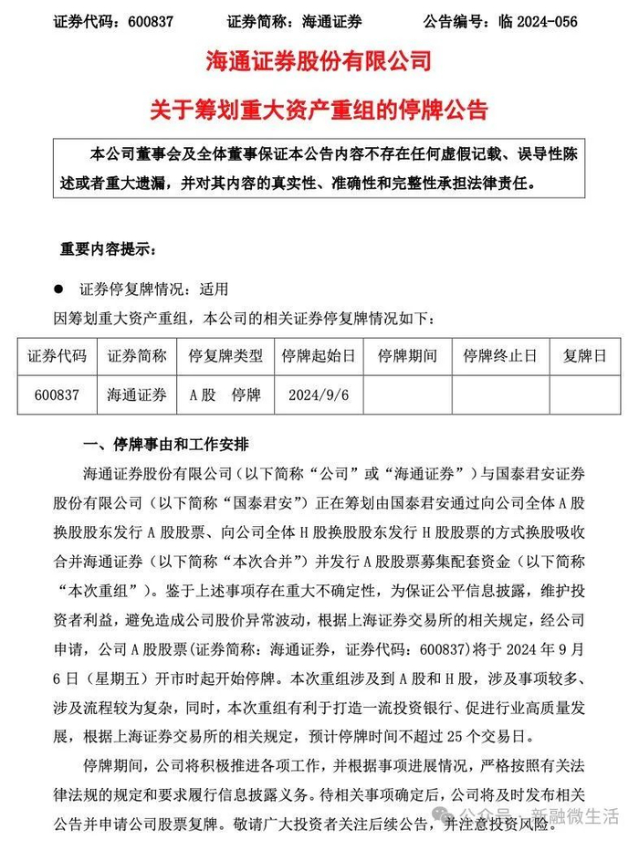 国泰君安海通证券今起停牌,中国资本市场规模最大A+H双边市场吸收合并官宣