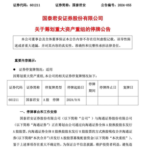 昨日晚间,国泰君安(601211.SH;2611.HK)、海通证券(600837.SH;6837.HK)双双发布停牌公告,拟筹划重大资产重组,股票今日起停牌。