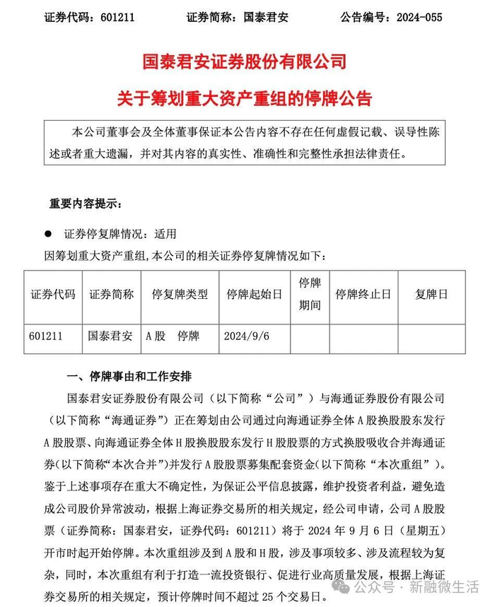 小编注意到,本次国泰君安与海通证券的合并重组,是新“国九条”实施以来头部券商合并重组的首单,也是中国资本市场史上规模最大的A+H双边市场吸收合并、上市券商A+H最大的整合案例,涉及多业务牌照与多家境内外上市挂牌子企业,属于重大无先例的创新事项。