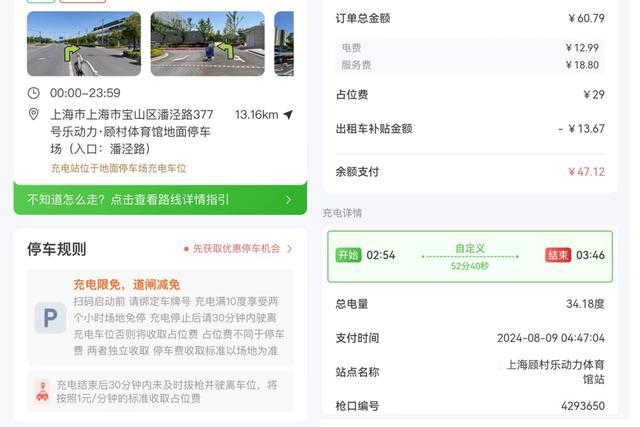市民蔡先生是一名出租车司机,8月初的一天凌晨,他在宝山区潘泾路377号乐动力体育馆地面停车场选择小鹏汽车的快充桩充电。他停好后,扫描充电桩上的二维码,登录联联充电Pro App,插好充电口便回车内等待。他记得,App上显示充电可限免停车2小时,于是安心地玩起手机。凌晨4时许,估摸着“限免时间”临近结束,蔡先生拔下充电头,驶离停车位,订单显示他需要支付47.12元,其中29元是占位费。