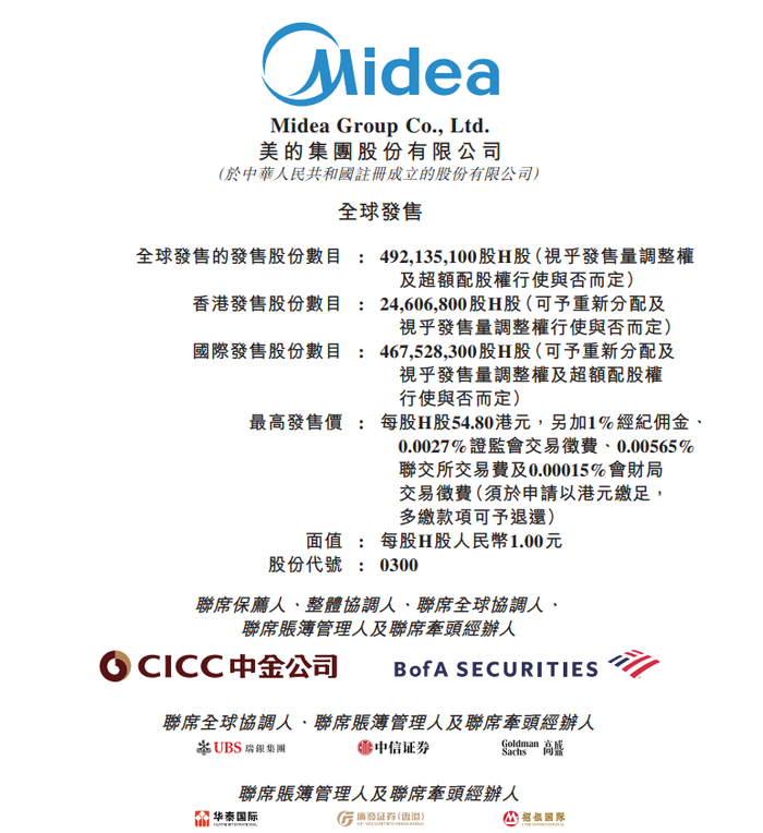 美的在港上市拟发行4.92亿股 最高54.8港元/股