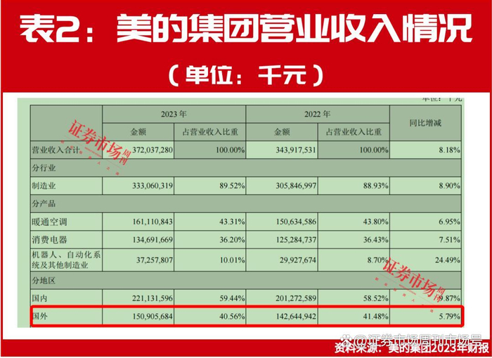 公司2023年财报显示, 美的集团海外业务的毛利率也略高于国内业务,2023年两者分别为27.16%,26.01%。同比增长速度也是海外业务的3.57%更高,而国内业务为1.33%。