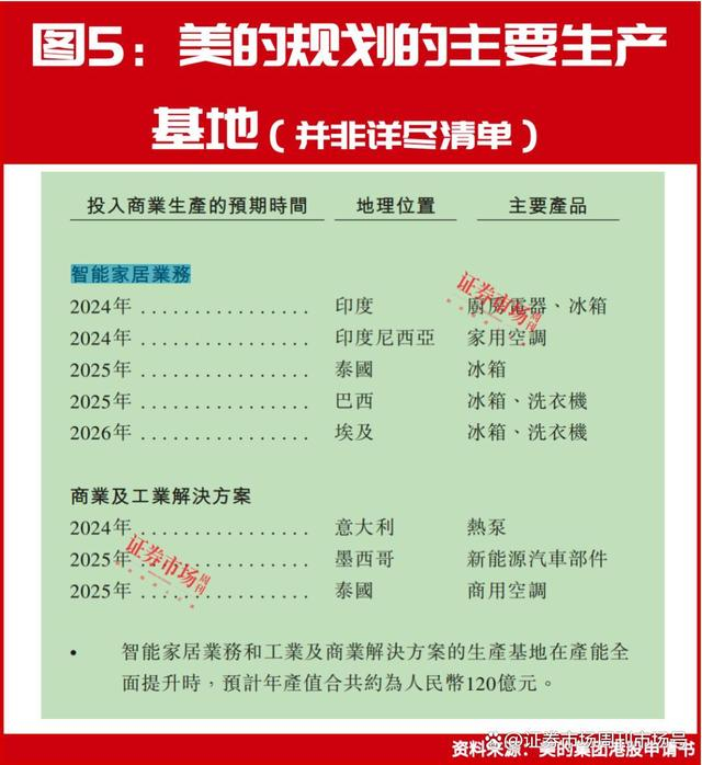 在公司的港股申请书中提到募集的资金, 预期未来一至三年将用于全球科技研发,扩大全球研发团队的规模,透过提供具备竞争力的薪资,吸引和挽留拥有高学历及深厚行业经验的研发人才。美的也将进一步扩展全球研发中心的布局,以强化产品本土化开发的能力。公司将结合自主资本开支、合资企业投资和收购等方式,在大型家电市场或欧洲、拉美、非洲、印度及东南亚等极具增长潜力的市场扩大产能,提升海外生产规模及质量,以满足当地客户对于我们智能家居业务和商业及工业解决方案的需求。图5为规划的全球生产基地。