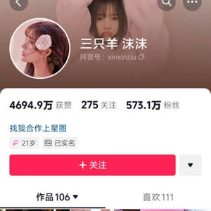 沫沫抖音主页显示,其粉丝量达573.1万,最后一个作品停留在2023年12月3日。据了解,沫沫于2023年6月左右加入三只羊。