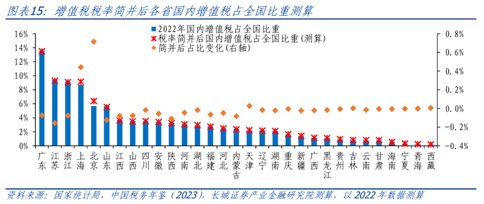 若未来增值税税率从“13%、9%、6%”简并至“9%、6%”,首先有助于降低间接税负担,其次有助于简便征收,进一步体现增值税的“中性原则”作用,缓解“高征低扣”和“低征高扣”现象,减轻留抵退税负担。我们依照上述方案测算税率简并后,地方政府增值税收入总量可能有所下降,地方间分布情况变化可能不大,北京、上海等经济生产附加值较高省份增值税收占全国比重可能略有上升。