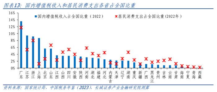若增值税地方分成部分采取消费地原则,人口、消费支出较高地区或可分得更多增值税收入,更好覆盖该地区留抵退税负担。我们以2022年各省居民消费支出占全国比重大致衡量消费地原则下的增值税地区分布,对比实际(生产地原则)增值税收入地区分布看,河南、湖南、河北、云南、广西、吉林等省(自治区)有望获得更高增值税收入。
