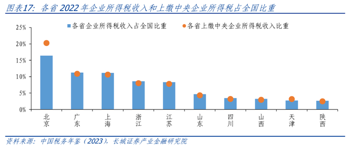 从企业所得税贡献省份看,由于企业所得税征收遵循生产地原则,生产大省如广东、上海、浙江、江苏、山东,央企集中地区如北京收入贡献较多。2022年,企业所得税收入排名前10的省(自治区、直辖市)已经贡献全国70%以上收入。