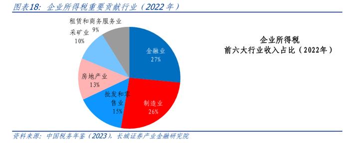 从企业所得税贡献行业看,第三产业税收贡献能力比第二产业更加突出。2023年发布的《中国税务年鉴》数据显示,2022年二产、三产国内增值税收入分别占比35.5%和64.5%,当年二产、三产占GDP比重分别为39.3%和53.5%。2022年企业所得税收前六大行业(金融业、制造业、批零业、房地产业等)合计占比已超过80%,显示出相关行业盈利能力和资本积累实力相对较强。金融业中,银行服务业贡献较高,制造业中,化学原料和化学制品、汽车、计算机通信电子设备以及烟酒制造业贡献较高。