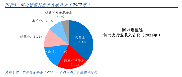 从增值税贡献行业看,第二产业税收贡献能力比第三产业更加突出。2023年发布的《中国税务年鉴》数据显示,2022年二产、三产国内增值税收入分别占比56.2%和43.8%,而当年二产、三产占GDP比重分别为39.3%和53.5%。主要是我国工业、建筑业等增值税的税率相对服务业更高。2022年制造业、批发零售业、金融业和建筑业四大行业国内增值税合计占比达到80%以上。制造业中,烟草、通用设备、汽车、计算机通信设备贡献较高。