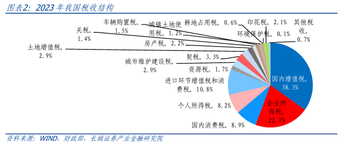 目前国内增值税是我国税收的第一大税种。财政部数据显示,2023年国内增值税收入6.93万亿元,占当年全国税收收入的38.3%,占GDP比重为5.5%。
