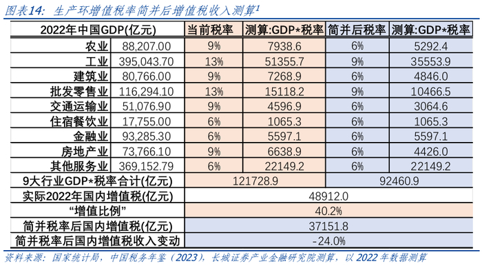 理论上,国内9大行业GDP*对应税率加总应大致接近国内增值税收入,我们测算发现国内增值税低于理论值(即GDP*税率)。2022年国内增值税为3.71万亿元,而同期全国国内9大行业GDP*对应税率加总约为12.2万亿元,实际国内增值税收入是理论值的40%左右。这可能是由于增值税对商品、劳务在流转过程中产生的增值额征收,而 GDP 是各行业增加值之和。我们假设税率简并后, 9大行业GDP*对应简并后税率加总后,对应国内增值税也是理论值的40%左右。