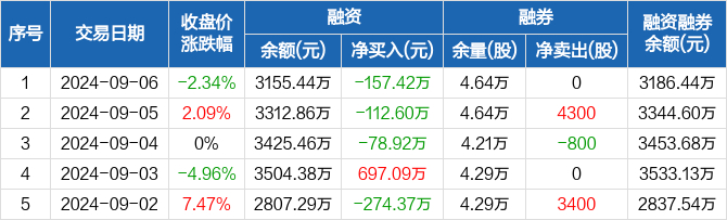 金安国纪融资融券信息显示,2024年9月6日融资净偿还157.42万元;融资余额3155.44万元,较前一日下降4.75%。
