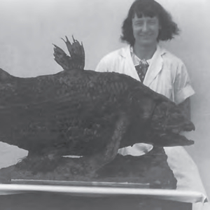 自豪的年轻博物馆员拉蒂迈小姐与她发现的拉蒂迈鱼。图| 东伦敦博物馆供图