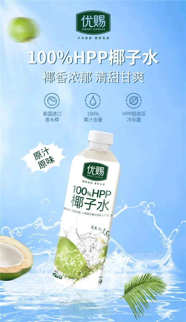 以食品饮料类商品为例,“优赐”从源头严格精选优质上乘原料,确保?材?然纯净与营养健康。如“优赐”HPP果汁系列,臻选了来自泰国丹嫩沙朵、陕西、新疆等核心产区的香水椰、霜打红富士、红心苹果等优质原料,结合HPP超高压低温灭菌技术,最大程度保留天然果香及营养成分,确保消费者能喝到真材实料的果汁。
