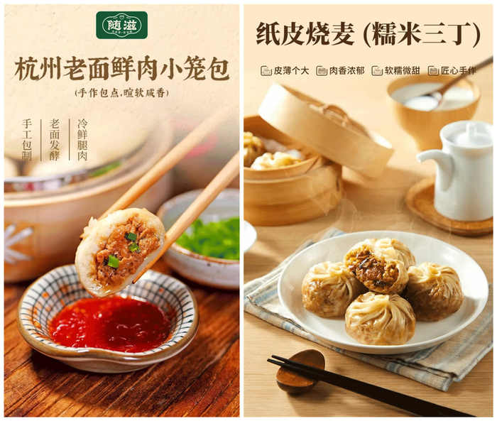 此外,自有品牌“随滋”推出了一系列适合早餐场景的产品,包括包子、花卷、烧麦这类早餐点心,另有酱卤、肠丸这类快手菜。其中作为主推品的“糯米三丁纸皮烧麦”,精选了太湖糯米、大块肉丁,搭配笋丁和香菇干,主打一个皮薄馅大,匠心手作;“杭州老面鲜肉小笼包”同样有用料大方,操作方便等卖点,精选了腿肉和面粉,无需解冻,蒸、煎两宜。
