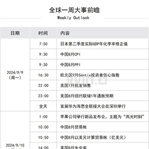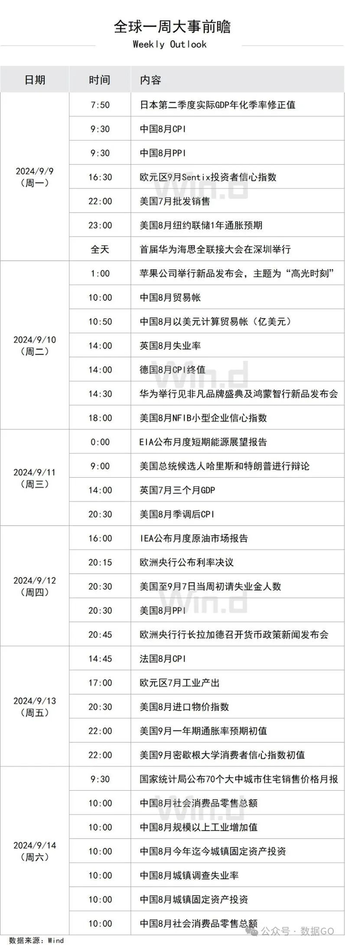 未来一周,全球市场大事不断。十四届全国人大常委会第十一次会议举行;中国8月一系列重磅经济数据全线出炉;美联储进入“静默期”,美国8月CPI备受关注;华为、苹果先后举行新品发布会;哈里斯与特朗普首场电视辩论举行;欧洲央行将公布利率决议。