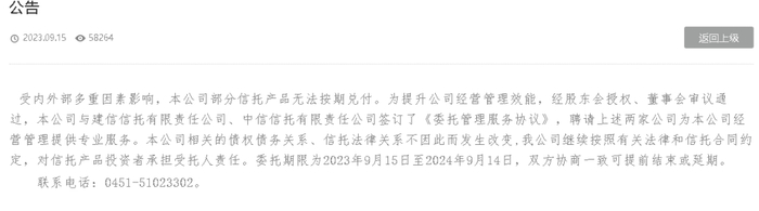 中融信托自2023年9月15日发布委托协议公告后,根据公告内容,委托管理期限将于本月14日。