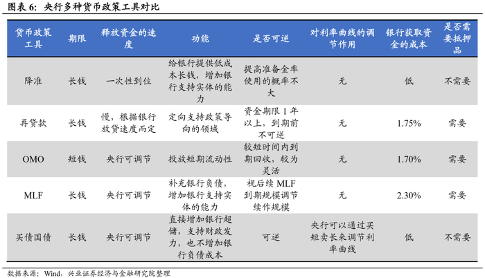 除了影响央行资产负债表科目的差异,降准、增加MLF、提供再贷款和二级市场买卖国债等货币政策工具在释放资金的速度、工具的可逆性、银行获取资金的成本、是否需要抵押品、对利率曲线的影响方面都存在差异: