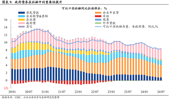 与降准的空间相比,央行买卖国债的空间显然更大一些。当前国债存量约为32万亿元,央行持有的国债占央行资产的比重仅为3.5%左右。考虑到政府债券在社融中的重要性提升,国债成为央行货币政策操作的主要标的也符合国际惯例。当前相较于央行资产端对其他存款性机构债权的占比,对政府债权科目仍有很大的提升空间。