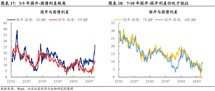 5)中短久期的国债和国开走势分化。3Y国开-国债利差回到2023年年初的水平,5Y国开-国债利差回到2024年年初水平。但7-10年期限上国开-国债利差没有大幅走扩。中短久期的国债和国开走势分化,主要是由于8月末央行首次公告了国债净买入操作,且央行在买卖国债的过程了进行了买入短期限国债并卖出长期限国债的操作。这使得中短久期国债相较于国开具备了品种溢价,使得3-5年国开与国债之间的利差出现大幅走扩。而长端国债而言央行是净卖出的操作,7-10年期限上国开-国债利差走扩幅度有限。