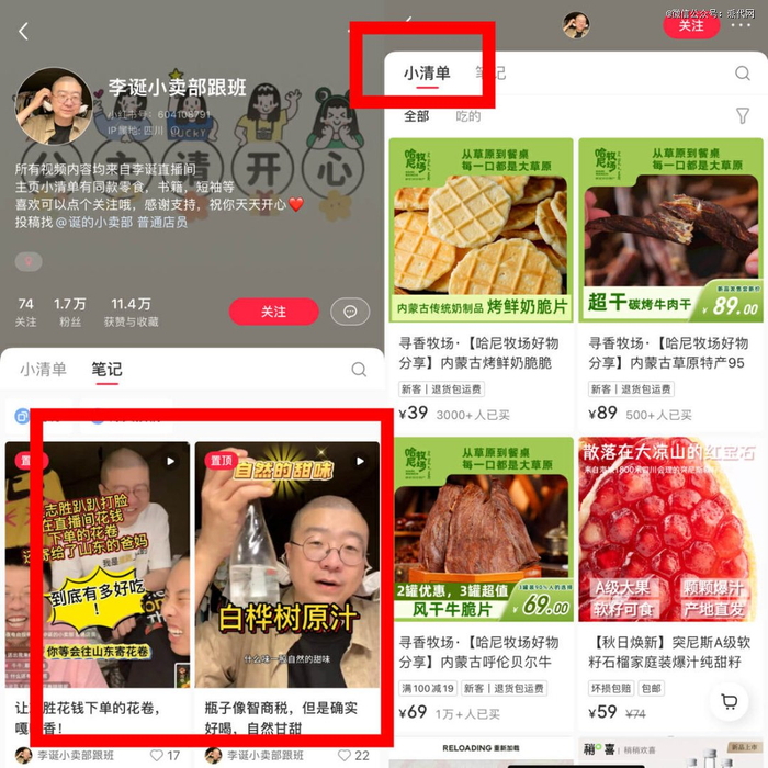 目前,李诞不仅在直播间里带货,还专门开设了“李诞小卖部跟班”、“李诞小卖部分部”等账号,将直播中的精彩片段或商品讲解片段单独呈现,并在主页小清单里开始带货,即行业内常说的“切片带货”。