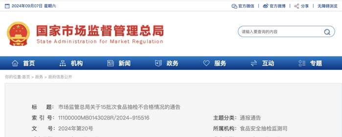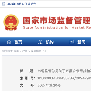 国家市场监管总局近期组织食品安全监督抽检850批次样品,检出15批次样品不合格。对抽检发现的不合格食品,有关省级市场监管部门已组织开展核查处置。