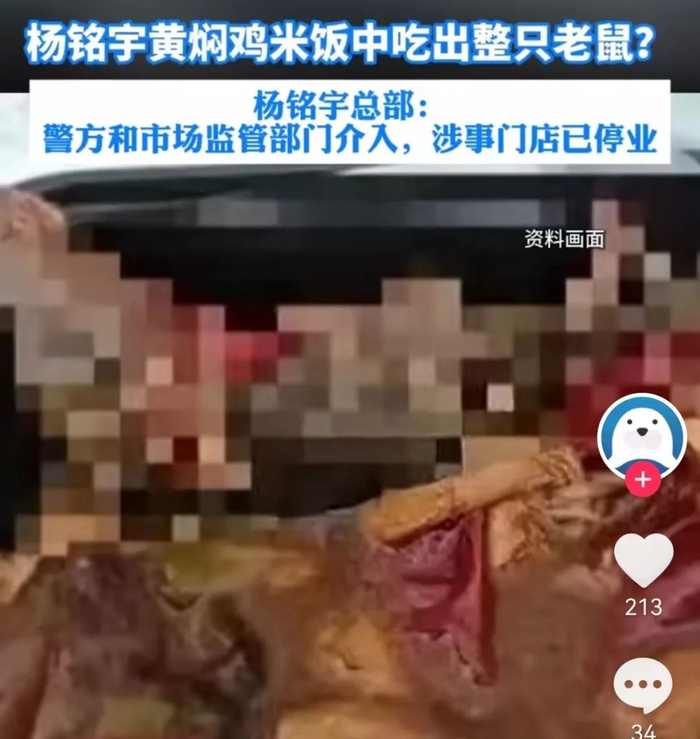 据悉,该品牌不是第一次被指出现食品安全问题。就在今年7月,四川成都一男子爆料称自己点了一份外卖,吃的过程中在餐盒中发现一整只“炖烂”的死老鼠。据他介绍,这份外卖来自成都杨铭宇黄焖鸡米饭(银泰城店)。发现异常后,该男子与商家反映,同时向当地市场监管部门举报。