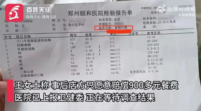 多位员工诊断证明书显示,诊断结果为“食物中毒”。王女士称,事后店方只愿意赔偿900多元餐费,医院已上报卫健委,正在等待调查结果。