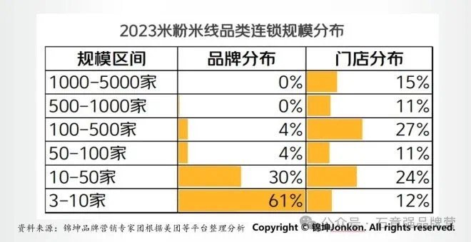 从连锁规模看,据美团数据显示,50家以下的连锁品牌占比达到91%。这是线上的情况。但在线下,还会有更多的夫妻店、小店分散在各个街道。据红餐大数据显示,2022年全国米粉品牌门店超9成在3家以下。米粉赛道连锁品牌发展空间还很大。