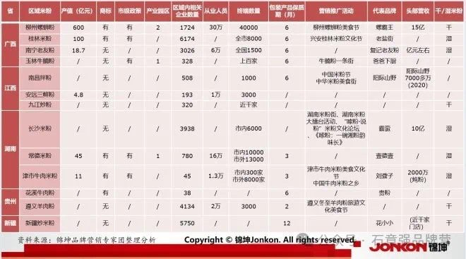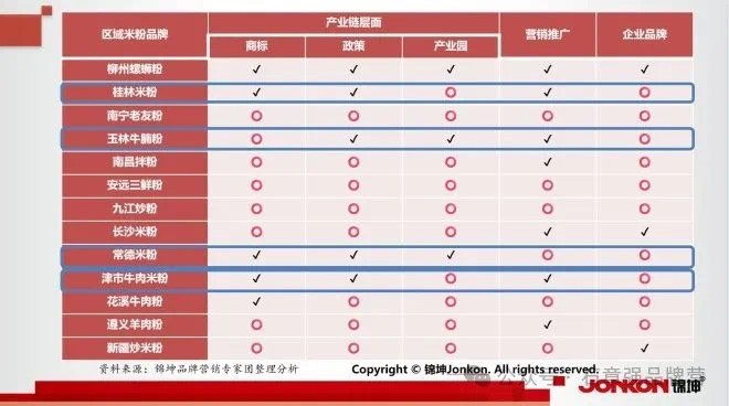 综合以上对各全省区域米粉品牌的整理和分析,我们锦坤品牌营销专家团从产业链层面(商标、政策、产业链)、品牌营销推广层面(是否有公开报道的营销推广活动)、企业品牌带动层面(是否有过亿的本地区域米粉品牌)等三个层面五个维度综合评价这些区域米粉品牌目前的发展。