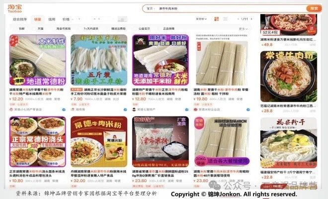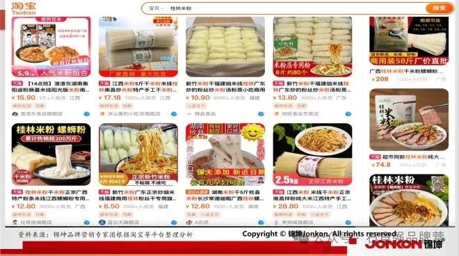 种子选手一号:桂林米粉。产值达到100亿元,有商标,有市级政策,没有查到产业园区,在淘宝搜到的桂林米粉包装产品保质期有3个月的,也有6个月的。同时,淘宝上的桂林米粉品牌并不多,且页面会展示较多桂林米粉干粉产品,这显示出桂林米粉的品牌化并不强。