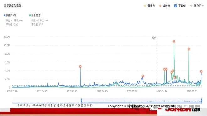新疆旅游热度近三年持续升高,在抖音·巨量引擎平台上对比“新疆旅游”和“新疆炒米粉”从2020.10至今的热度,两者变化较为统一。从几次热度的起伏来看,新疆旅游对新疆炒米粉的带动作用较为明显。