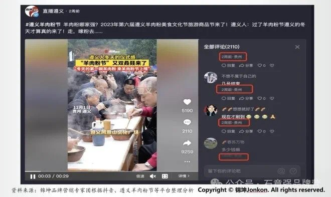 遵义羊肉粉在商标、市级政策、产业园区、代表品牌方面都较为欠缺,不过在营销推广方面,遵义冬至羊肉粉节已经举办了六届,热度主要在省内,省外的声量较小,这一点可以从抖音发布相关视频的回复IP地主要在贵州可以看出。