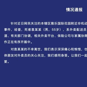 针对近日网民关注的本辖区雅乐国际花园附近非机动车道上一男子晕倒经抢救无效宣布死亡事件,经查,死者袁某某(男,55岁),系外卖配送员,公安部门已排除刑事案件可能。经街道、有关部门协调,相关外卖平台、保险公司与家属协商,目前事件相关方已达成一致,善后工作正在有序开展中。对袁某某的不幸离世,我们表示深深痛心和惋惜,也对家属表示深切的慰问。广大网友和媒体朋友对外卖员的关心关注,我们感同身受。让我们一起努力,用实际行动创造更多的温暖和关爱。