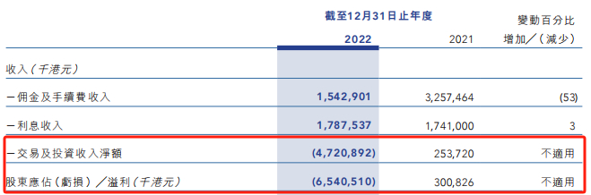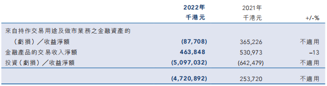 在海通国际各项业务中,交易及投资收入下降幅度最大。2021年公司交易及投资收入净额为2.54亿港元,同比下滑92%。到了2022年,海通国际这一项收入直接变为-47.21亿港元,直接导致公司当年股东应占亏损65.41亿港元。