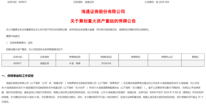 9月5日晚间,国泰君安和海通证券双双发布公告称,国泰君安与海通证券正在筹划由国泰君安吸收合并海通证券并发行股票募集配套资金。两家公司将于6日开市起开始停牌。